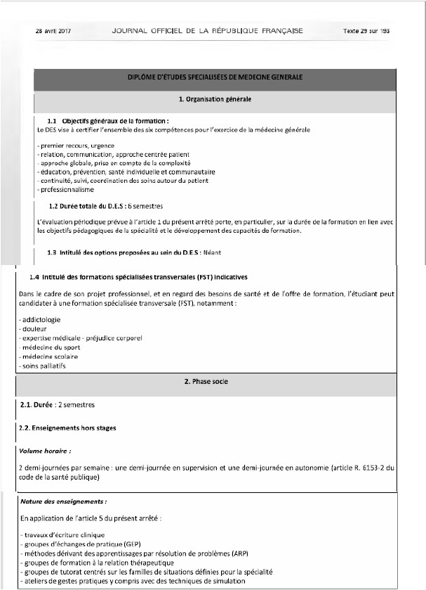 Arrêté du 21 avril 2017 – Maquette du DES de médecine générale – JO du 21 avril 2017