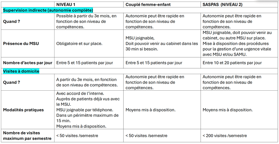 Selon le niveau de compétences de l’interne, ce stage se situe entre le stage de niveau 1 et le niveau 2 en termes d’autonomie en consultation. La supervision est également systématique.
